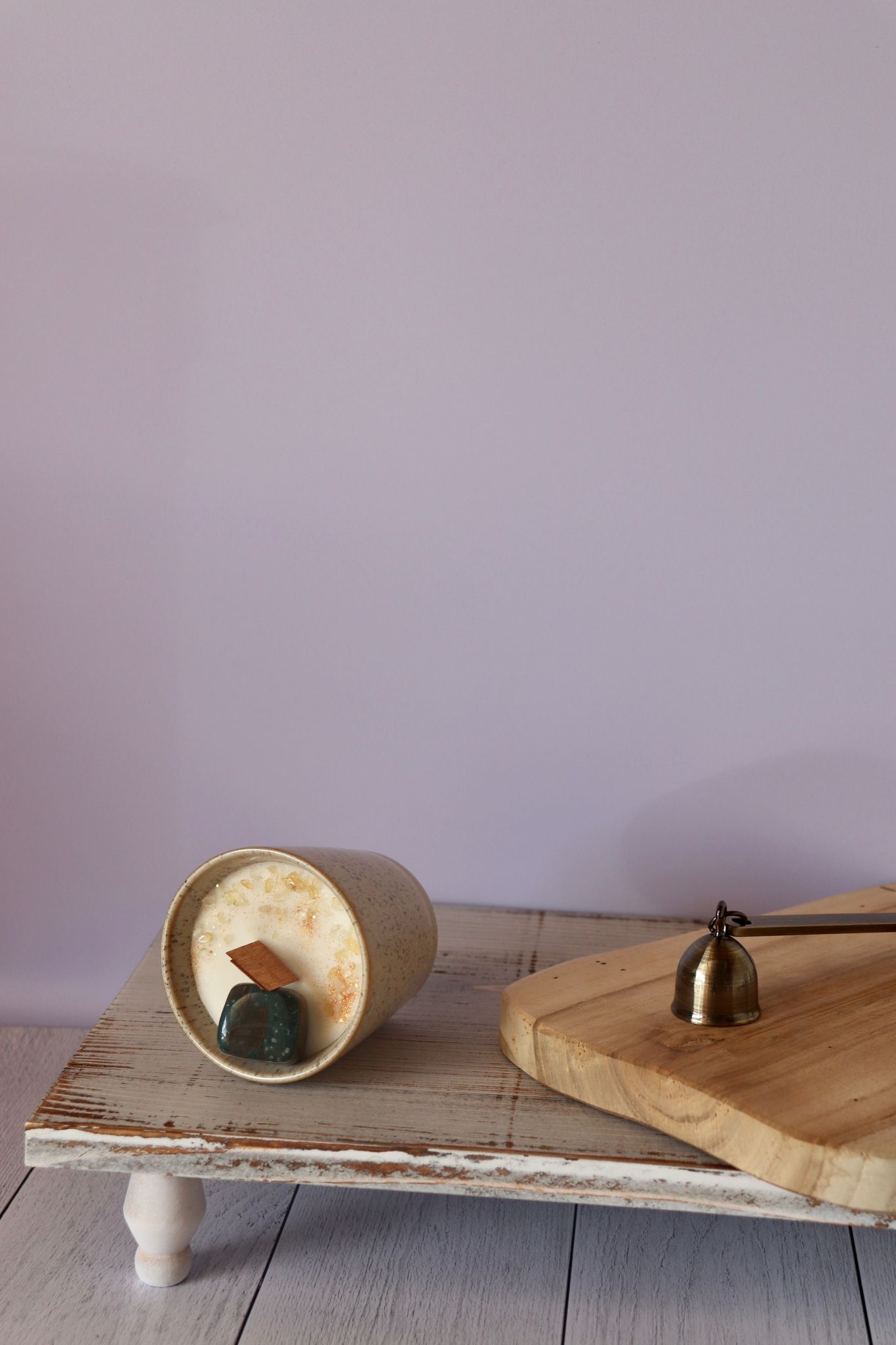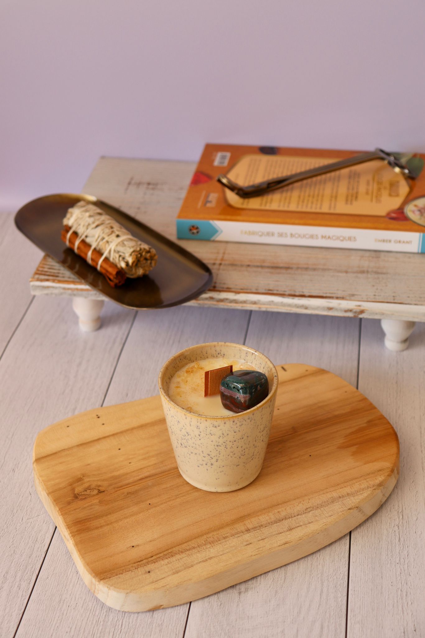 Bougies magiques en cire de colza sans OGM et leurs infusions de pierres naturelles, fragrances de Grasse sans CMR et phtalates. Contenants de seconde main.